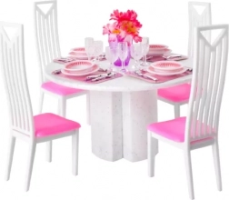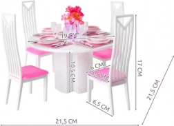 Acest set de mobilier bine gândit transformă orice căsuță de păpuși într-o sufragerie primitoare. Datorită detaliilor realiste – de la suporturile roz la farfurii, tacâmuri și pahare – copiii se vor bucura de ore întregi de joc de imaginație și de servit masa cu păpușile.