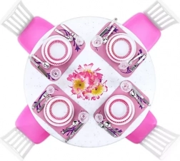 Setul include o masă rotundă, 4 scaune, două tipuri de farfurii, suporturi/șervețele de masă, tacâmuri complete pentru 4 persoane, 8 pahare și o vază decorativă cu flori – totul asortat într-o elegantă combinație alb‑roz.