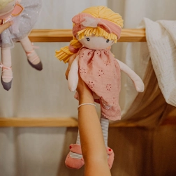 Păpușa Suzette, în rochiță roz din bumbac cu broderii florale delicate, balerini și bentiță cu fundă, stimulează imaginația copiilor și jocul tandru. Datorită construcției moi, este potrivită ca prima păpușă pentru bebeluși și toddleri.