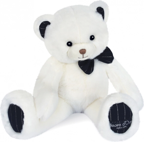 Ursuleț de pluș drăgălaș și foarte moale, în culoarea fildeșului, cu papion bleumarin în dungi, ideal ca primul prieten în pătuț și ca decor pentru camera copilului. Este confecționat din pluș premium, catifelat, respectă normele europene CE și este potrivit de la naștere. Include o cutie cadou frumoasă, fiind un dar minunat pentru Crăciun sau pentru venirea pe lume a bebelușului.