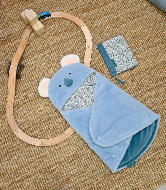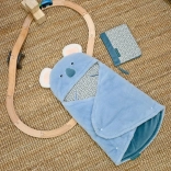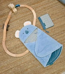 Pătură din pluș moale și călduroasă cu glugă din colecția Yoca le Koala, ideală pentru bebeluși încă de la naștere. Oferă un sentiment de siguranță și căldură acasă și în călătorii, are deschideri practice pentru centuri pentru cărucior sau scaun auto și închidere ușoară cu capse. Fabricată din material premium cu fibre reciclate și în conformitate cu normele europene CE.