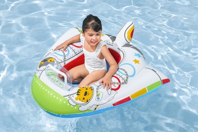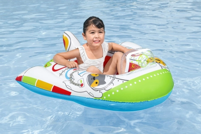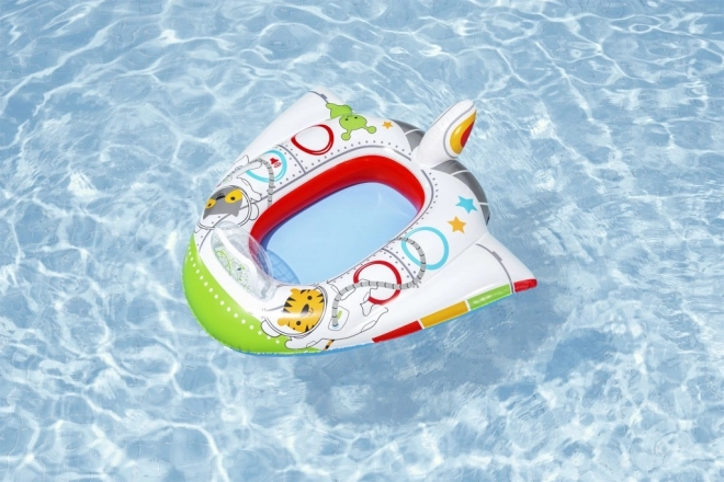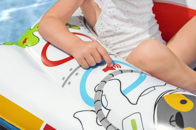 Bărcuța este decorată cu ilustrații colorate ale unor personaje spațiale, atrăgătoare pentru copii.