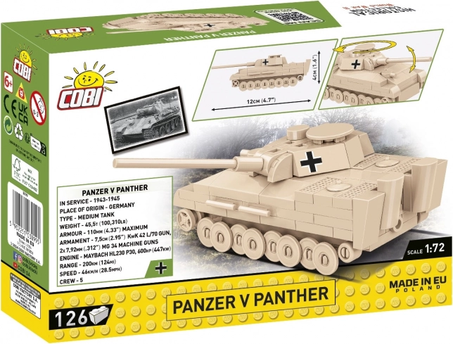 Mini modelul legendarului tanc Panzer V Panther de la COBI la scara 1:72 din 126 de piese îi va încânta atât pe începători, cât și pe colecționari. Oferă o turelă rotativă, o țeavă mobilă și imprimări de calitate cu marcaje istorice. Fabricat în UE, pe deplin compatibil cu alte mărci, cu instrucțiuni ilustrate clare.