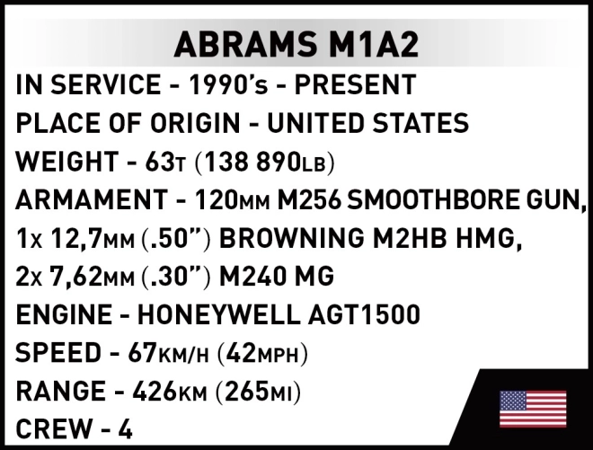 Cu setul de construcție COBI Abrams M1A2 veți realiza un mini model realist al unui tanc principal de luptă modern. La scara 1:72, modelul final măsoară aproximativ 14 cm și păstrează liniile caracteristice și marcajele autentice ale originalului.