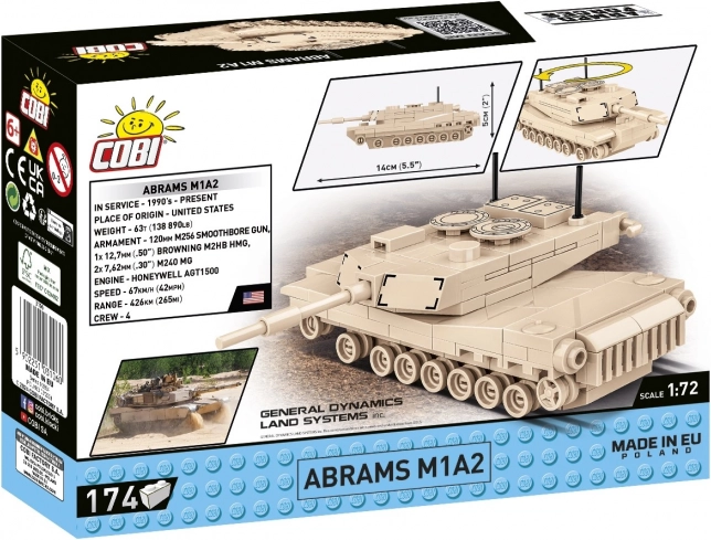 Construiți tancul american iconic COBI Abrams M1A2 la scară 1:72 din 174 piese. Modelul oferă o turelă rotativă, șenile mobile și detalii imprimate, este compatibil cu alte seturi de construcție și, după asamblare, măsoară 14 cm.