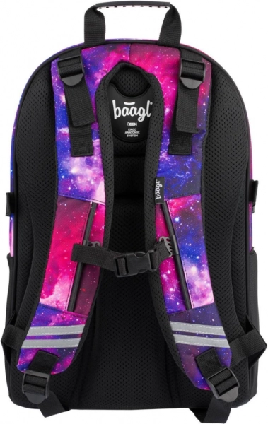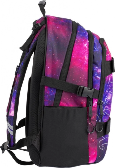 Setul școlar BAAGL Skate Galaxy, cu design cosmic, îi va bucura pe toți elevii. Conține un rucsac ergonomic ușor, cu volum de 25 l și buzunar pentru laptop de 15", un penar rigid fără rechizite și un săculeț practic pentru pantofi de schimb. Rucsacul are spate ergonomic modelat, bretele reglabile, inclusiv pe piept, chingi pentru skateboard, elemente reflectorizante și este fabricat din material rezistent la apă. Întregul set se remarcă prin construcție ușoară (850 g) și organizare bine gândită pentru purtare confortabilă zi de zi.