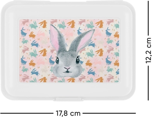 Designul minimalist, în alb, este completat de încântătorul motiv Bunny, care îi va bucura atât pe copii, cât și pe iubitorii detaliilor jucăușe. Cutia este ușoară, ușor de transportat și încape în rucsacul școlar sau în geantă.