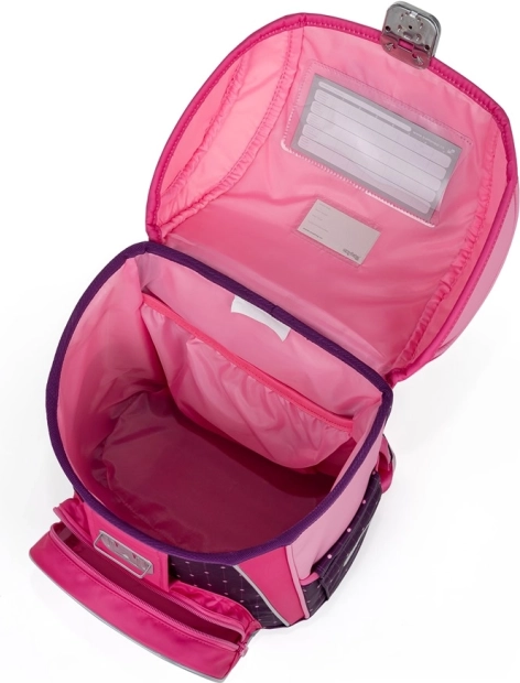 Compartimentul principal cu buzunar interior, etichetă și orar permite organizarea eficientă a rechizitelor școlare. Buzunarele din față și laterale oferă spațiu pentru cutia de sandviș și alte accesorii.