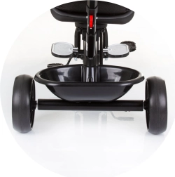 Siguranța este pe primul loc: tricicleta are bară de protecție detașabilă, centuri de siguranță și o construcție stabilă. Părinții vor aprecia mânerul reglabil, reazemele pliante pentru picioare și coșurile practice pentru mărunțișuri în față și spate. Când copilul este pregătit, bara și mânerul cu copertina pot fi îndepărtate, iar micul rider poate pedala singur.