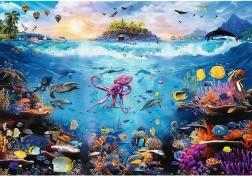Descoperă mega puzzle-ul cu motivul recifului de corali, cu uimitoarele 13 500 de piese. Sistemul unic Prime UFT îmbină cel mai gros carton de pe piață, piese special conturate și o îmbinare stabilă, care permite transportarea și rotirea în siguranță a secțiunilor finalizate. Asamblează 9 panouri a câte 1500 de piese într-o singură imagine uriașă sau creează-ți propria compoziție și scufundă-te în paradisul subacvatic plin de pești, corali și țestoase.
