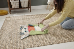 Salteluța este realizată din țesătură ce conține 90% plastic reciclat și este livrată într-un ambalaj certificat FSC. Datorită designului inteligent, o rulezi simplu, o fixezi cu „lăbuțele” și o iei cu tine oriunde. Jucăriile detașabile se prind ușor de bucle, astfel încât joaca este mereu nouă și stimulativă.