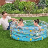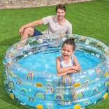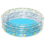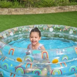 Această piscină gonflabilă pentru copii, cu grafică jucăușă cu fructe, transformă grădina într-un mic loc de scăldat. Construcția cu trei inele asigură stabilitate și durabilitate sporite, în timp ce fundul gonflabil moale oferă confort atât la stat, cât și la joacă. Datorită dimensiunilor compacte, piscina se amplasează ușor pe gazon sau terasă, iar întreținerea este simplă.