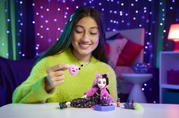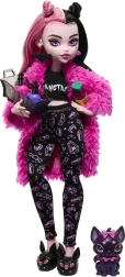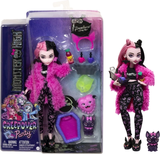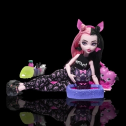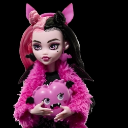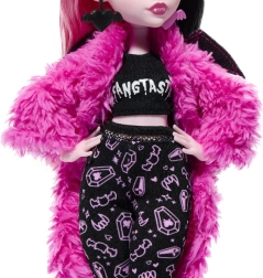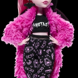 Vampirița stilată Draculaura a sosit într-o ținută confortabilă de pijama, cu o jachetă roz pufoasă, crop top și colanți cu imprimeu. Datorită articulațiilor din talie, coate, încheieturi și genunchi, adoptă cu ușurință poziții de vedetă și stimulează povești pline de imaginație.