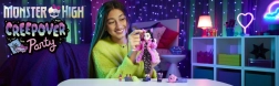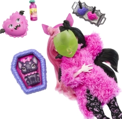 Pachetul include un set bogat de accesorii pentru o atmosferă „creepover” desăvârșită: mască pentru față, sticluță de „băutură”, lac de unghii, pernuță și coșuleț pentru manichiură. Lumea Monster High nu ar fi completă fără tovarășul de nădejde – animăluțul liliac are propriul pat în formă de sicriu.