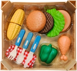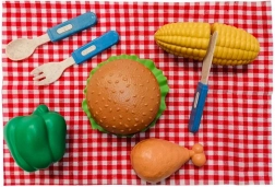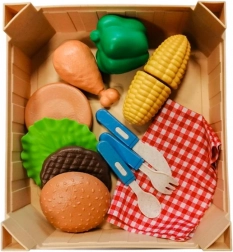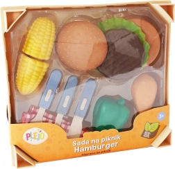 Setul de picnic Plejo este ideal pentru toți micii bucătari care doresc să trăiască o experiență autentică în pregătirea propriului burger. Include o gamă variată de imitații de alimente din plastic, inclusiv chiflă de hamburger, carne, legume și accesorii.