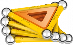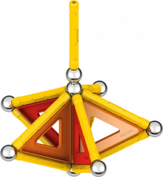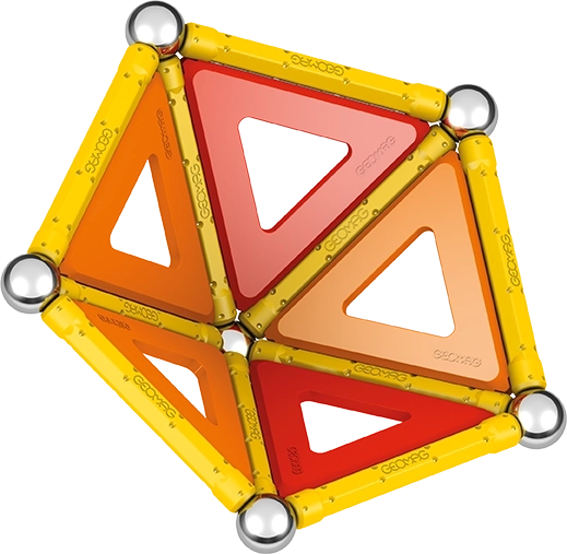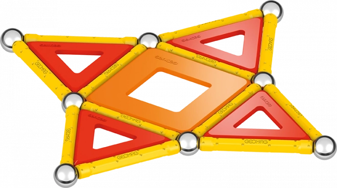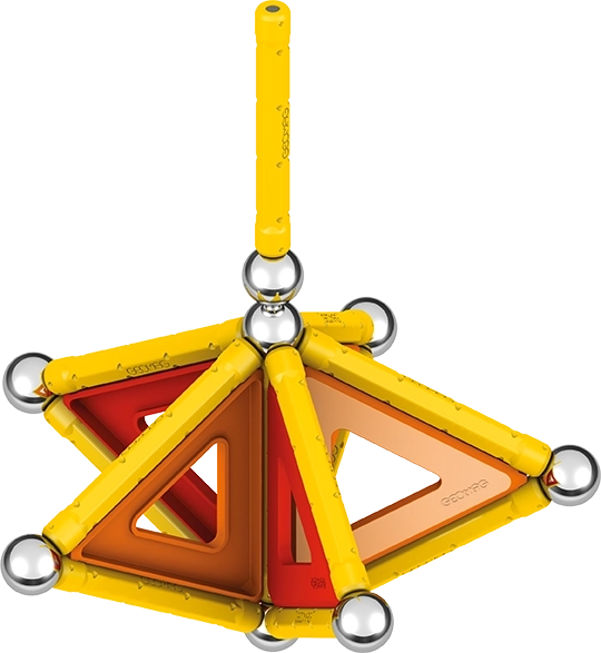 Ce găsiți în pachet: 12 tije magnetice galbene, 12 bile de oțel, 8 panouri triunghiulare, 2 panouri pătrate, 1 panou portocaliu în formă de pentagon și o cutie din plastic pentru bile și tije.