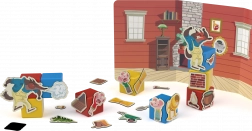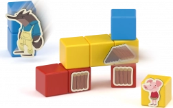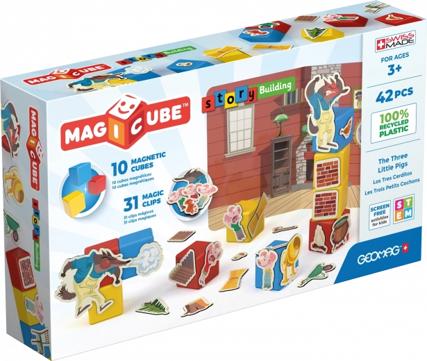 Setul conține 10 cuburi magnetice solide și 31 de cleme ilustrate cu motive ale purcelușilor, lupului și construcției căsuțelor, astfel încât micii creatori pot re-povesti istoria cunoscută sau pot inventa altele noi. Materialele sunt sigure pentru sănătate și realizate cu precizia elvețiană specifică mărcii Geomag.