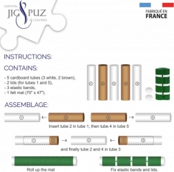 Pachetul conține tot ce ai nevoie: tuburi din carton pentru un miez rigid, covoraș din fetru 180 × 120 cm, capace din plastic și benzi de prindere. Datorită dimensiunii mari, covorașul oferă suficient loc și pentru sortarea confortabilă a pieselor după forme și culori, accelerând și făcând mai plăcută asamblarea.