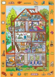 Puzzle-ul cu tema „În casă” aduce o combinație unică între asamblare și joc de căutare. Copiii asamblează mai întâi o imagine mare și colorată, apoi caută în ea elementele ascunse, afișate pe marginile ramei. Distracția nu se termină odată cu plasarea ultimei piese.