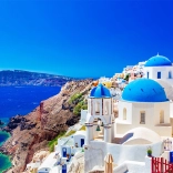Puzzle-ul prezintă cupolele albastre iconice și clădirile albe din Santorini, care atrag turiști din întreaga lume.