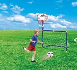 Acest set sportiv pentru copii 2 în 1 combină o poartă de fotbal și un coș de baschet, astfel încât copiii pot alege oricând dacă vor să marcheze goluri sau să înscrie la coș. Datorită dimensiunilor compacte (poartă 88 × 55 × 45 cm, coș 87 cm) este potrivit atât pentru camera copilului, cât și pentru grădină.