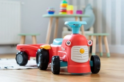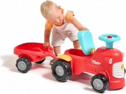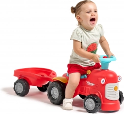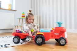 Acest împingător roșu pentru copii, în formă de tractor cu remorcă detașabilă, este vehiculul ideal pentru început pentru cei mici. Datorită construcției stabile și capacității maxime de 25 kg, deplasarea este sigură și confortabilă. Puntea față rotativă ușurează virajele, iar claxonul din ghidon adaugă un plus de distracție la fiecare plimbare.