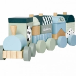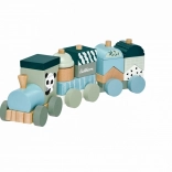 Locomotiva și cele două vagoane cu pini le permit copiilor să așeze și să rearanjeze 13 cuburi colorate cu forme și modele diferite – ideal pentru dezvoltarea imaginației și a motricității fine.