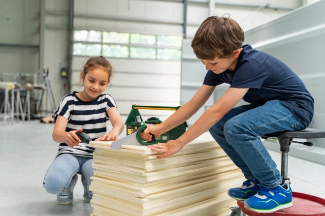 Valiza este fabricată în Germania din plastic durabil și păstrează toate piesele ordonate la un loc. Datorită compatibilității cu sistemele de șuruburi BOSCH și Technico, copiii își pot extinde echipamentul și își pot dezvolta motricitatea fină, creativitatea și gândirea tehnică.