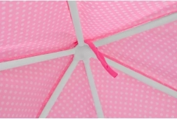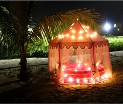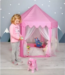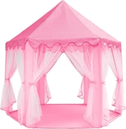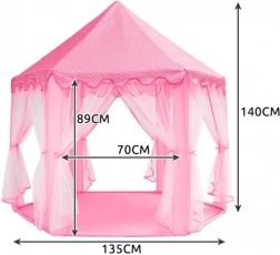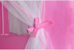 Acest cort roz pentru copii creează un „palat” primitor, unde se dezvoltă imaginația celor mici. Baza hexagonală oferă suficient spațiu pentru perne, jucării de pluș și cărți, în timp ce perdelele translucide din plasă de la cele șase intrări oferă un plus de intimitate și, în același timp, asigură o circulație excelentă a aerului. Cortul este potrivit pentru joacă pentru până la 2 copii, sub supravegherea adulților.