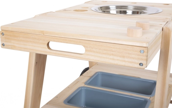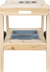 Două boluri detașabile și o chiuvetă din inox invită la amestecat, turnat și „gătit”. Alternativă ideală la lada de nisip pentru dezvoltarea simțurilor și a imaginației.