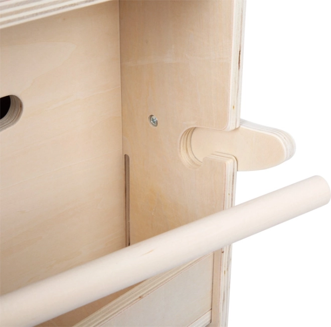 Între „colți” se află o bară din lemn extensibilă pentru agățarea unei role de hârtie – copiii au desenul mereu la îndemână, iar ordinea se păstrează.
