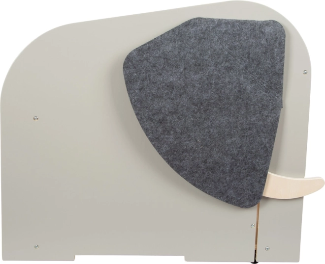 Cutia oferă spațiu generos pentru jucării mai mari, compartimente frontale pentru cărți și materiale de scris, iar între „colți” ascunde o bară extensibilă pentru agățarea rolei de hârtie de desen. Urechile din fetru de calitate acoperă orificii secrete, „coada” rotativă de elefant servește drept mâner comod pentru deschidere și închidere și poate ascunde mărunțișuri.
