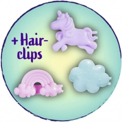 Evi are păr lung roz și agrafe colorate în formă de norișor, curcubeu și unicorn pentru coafuri nesfârșite.