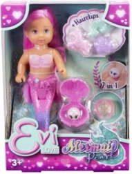Păpușa Evi ca sirenă de mare cu perlă îi va fermeca pe cei mici cu coada mov de pește și părul lung roz, care poate fi aranjat cu ajutorul agrafelor incluse în formă de norișor, curcubeu și unicorn. Setul include și o perlă magică, care poate fi introdusă într-un ineluș pentru copii și transformată într-o bijuterie fermecată.