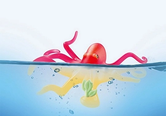 La contactul cu apa caldă, caracatița își colorează corpul în nuanțe de galben – un efect distractiv care stimulează curiozitatea și joaca interactivă.