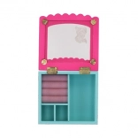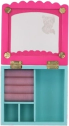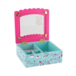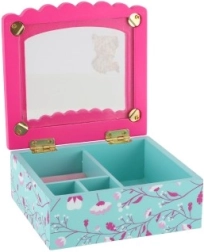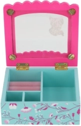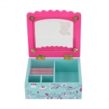 Această cutie de bijuterii decorativă, din lemn de calitate, este o soluție excelentă pentru depozitarea ordonată a inelelor, cerceilor și micilor comori. Capacul roz, cu parte din sticlă/transparentă și oglindă interioară, ușurează alegerea rapidă a accesoriilor, în timp ce baza turcoaz cu model floral fin adaugă un accent fermecător interiorului.