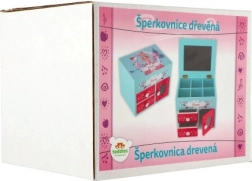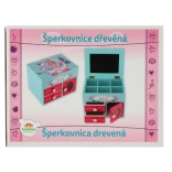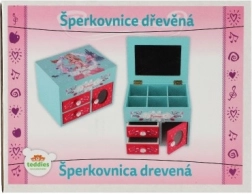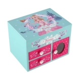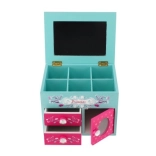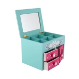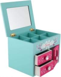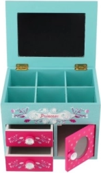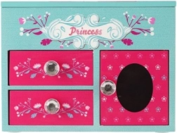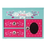 Această drăgălașă cutie de bijuterii din lemn, în nuanțe turcoaz-roz, cu motive de prințesă și flori, este o soluție excelentă pentru organizarea inelelor, cerceilor, brățărilor și a micilor secrete. Sub capacul rabatabil cu oglindă găsești compartimente divizate pentru o vedere de ansamblu zilnică și o alegere rapidă.