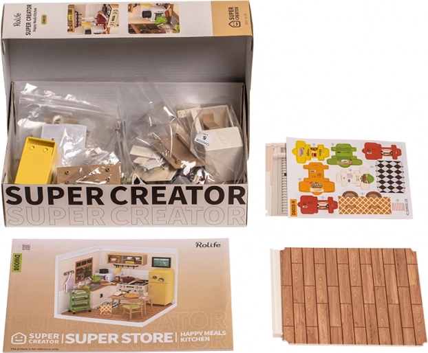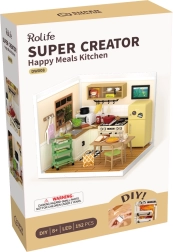 Construiește-ți propriul colțișor de bucătărie confortabil cu setul miniatural ROBOTIME Happy Meals. Această drăgălașă machetă oferă design vintage, detalii realiste ale mâncărurilor, cuptor și frigider care se deschid și iluminare LED pentru o atmosferă perfectă. Ideală ca proiect creativ și decorațiune stilată pentru interior.