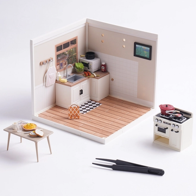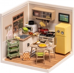 Descoperă lumea miniaturilor detaliate ROBOTIME și creează-ți o bucătărioară relaxantă în culori calde și domolite. Modelul include aragaz, dulapuri, mobilier de dining și accesorii mărunte care arată natural și autentic. Datorită iluminării LED, fiecare detaliu iese în evidență, iar creația ta devine piesa de rezistență a raftului sau biroului.