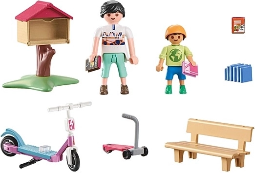 - Set frumos conceput cu două figurine PLAYMOBIL, bibliotecă cu suport de cărți, stivă de cărți, trei cărți, o bancă și alte accesorii.