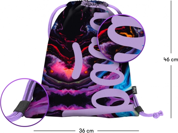 Motivul abstract puternic, în nuanțe de mov, albastru și roz, adaugă ținutei tale un plus de stil și garantează că sacul nu va trece neobservat.