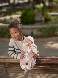 Trup din bumbac și membre din vinil, completate de hăinuțe în patru piese, pernuță și suzetă – totul pregătit pentru joacă imediată.