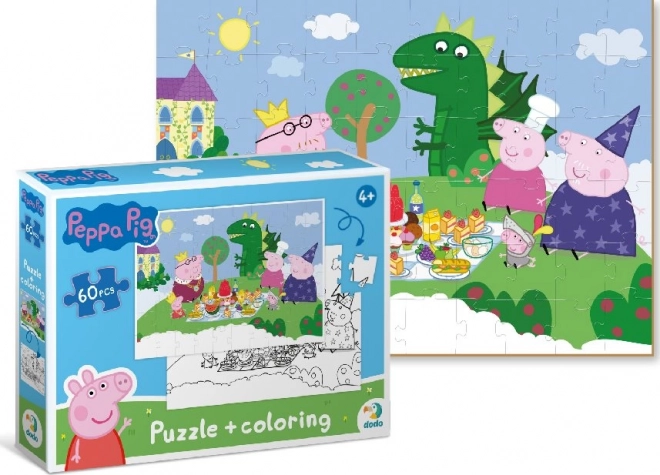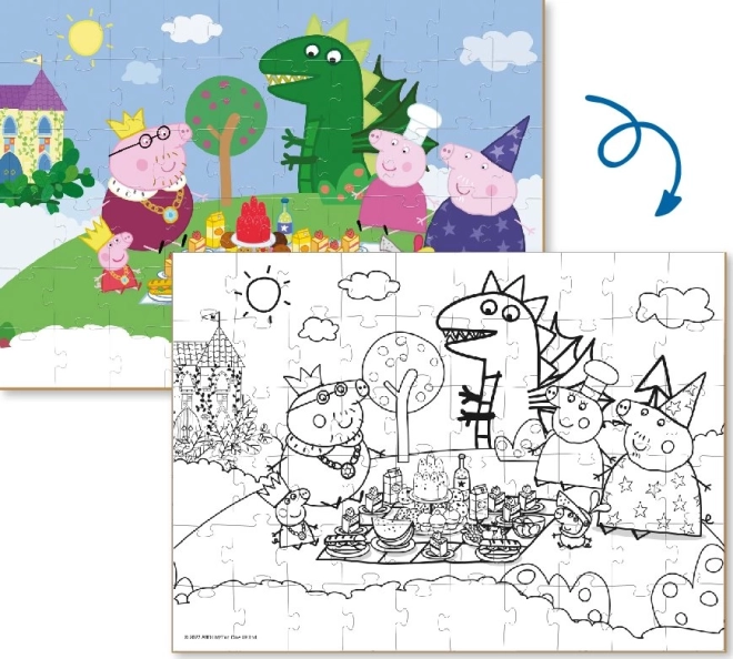 Acest puzzle față-verso oferă copiilor dublă porție de distracție. Mai întâi asamblează un motiv vesel cu personajele îndrăgite din lumea Peppa Pig, apoi pot colora după propria imaginație cealaltă parte, alb-negru, după ce termină. Imaginea asamblată are dimensiunea de aproximativ 32 × 23 cm, potrivită pentru măsuța copilului.