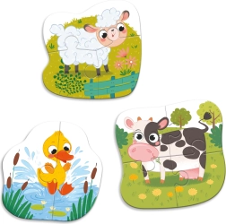 Acest set conține trei puzzle-uri conturate separate, cu motive de animale de la fermă, fiecare cu un număr diferit de piese (2, 3 și 4). Datorită dificultății progresive, este ideal pentru primele încercări de asamblare, întărește concentrarea și aduce copiilor bucuria reușitei.