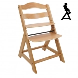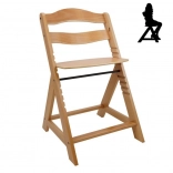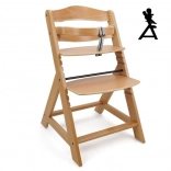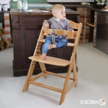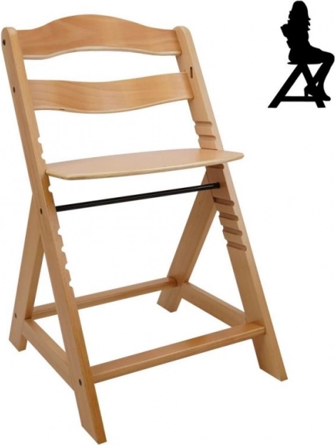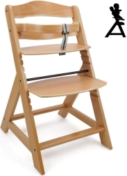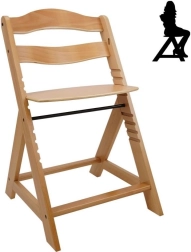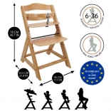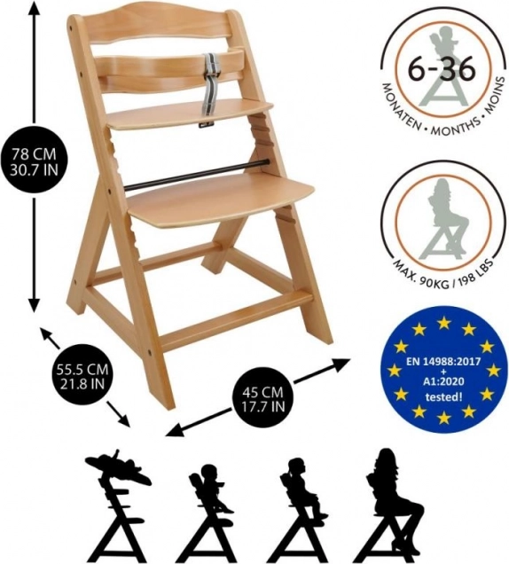 Scaunul de dining din lemn cu creștere este proiectat pentru a oferi confort maxim și siguranță copiilor de la șase luni. Este echipat cu setări multiple de înălțime pentru șezut și suport picioare, astfel încât poate fi utilizat de la o vârstă fragedă până la adolescență. La atingerea unei vârste mai mari, bara din față și separatorul se pot detașa, iar scaunul poate fi transformat într-un scaun normal. Este fabricat din lemn de fag german de calitate, oferind stabilitate și eleganță. Capacitatea sa maximă de greutate este de până la 90 kg.