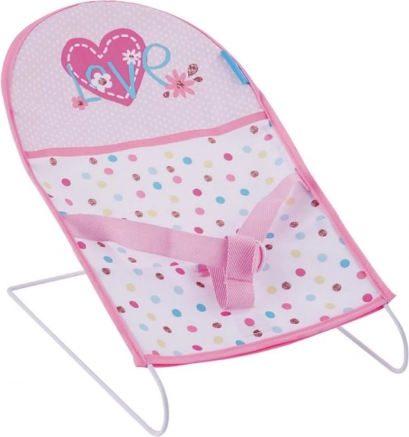 Balansoarul cu cadru metalic oferă o ședere confortabilă păpușii care se joacă. Este echipat cu o centură de siguranță și imprimeu cu inimioare și flori.