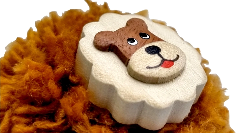 Această decorațiune originală îmbină eleganța lemnului cu finețea pomponului din bumbac. Este realizată manual din până la cinci tipuri de lemn – jackfruit, tamarind, casiă, aniba și gmelina arborea. Culorile sunt naturale, lemnul nu este vopsit; aspectul este completat de o pictură fină realizată manual. Motivul leului va încânta atât copiii, cât și adulții și va aduce un plus de farmec oricărui interior.
