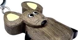 Brelocul stilat din lemn în formă de șoarece atrage prin aspectul său natural și prelucrarea manuală de calitate. Este un accesoriu durabil și funcțional pentru chei, geantă sau rucsac, care datorită inelului metalic se prinde sigur. Combinația a până la cinci tipuri de lemn, cu culoare naturală, face din fiecare piesă un accesoriu original și un cadou universal plăcut pentru iubitorii naturii și ai animalelor.