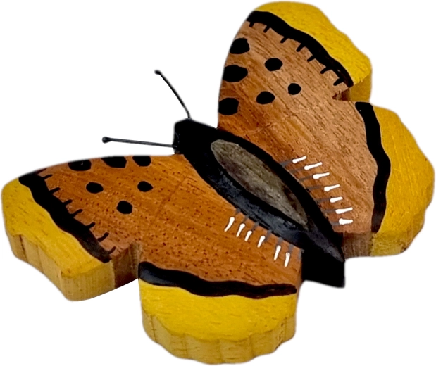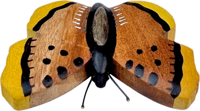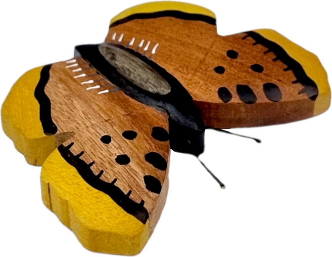 Adu o notă de natură în casă cu magnetul din lemn în formă de fluture. Fiecare piesă este realizată și pictată manual, iar cromatica rezultă din combinația a până la cinci tipuri de lemn – de la gmelina deschisă la culoare și arborele-pâinii galben până la cassia mai închisă. Rezultatul este un aspect autentic cu fibră fină a lemnului.