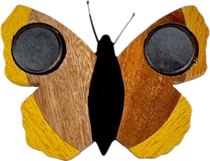 Lucrat manual, materiale naturale și un motiv superb de fluture – acest magnet din lemn va înfrumuseța orice frigider sau tablă magnetică. Este compus din până la cinci tipuri de lemn și este doar pictat manual, astfel încât ies în evidență culorile naturale, execuția precisă și designul original. Un element decorativ grozav și un mic cadou pentru iubitorii naturii.